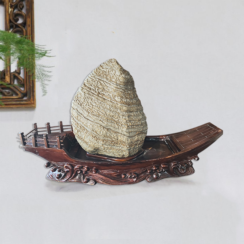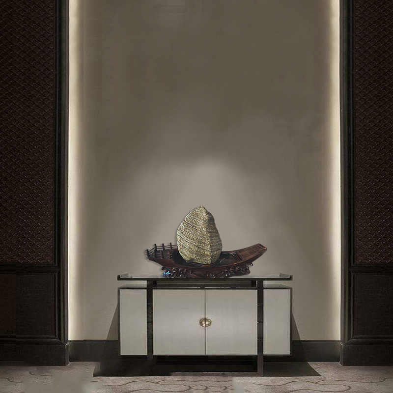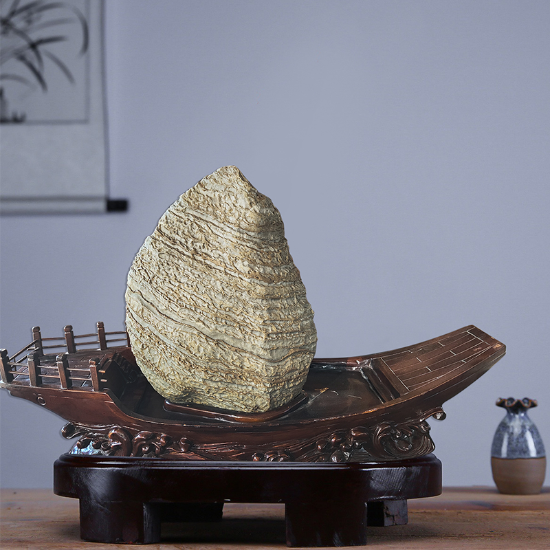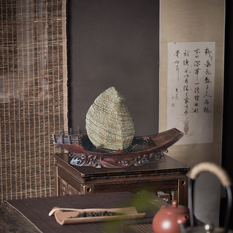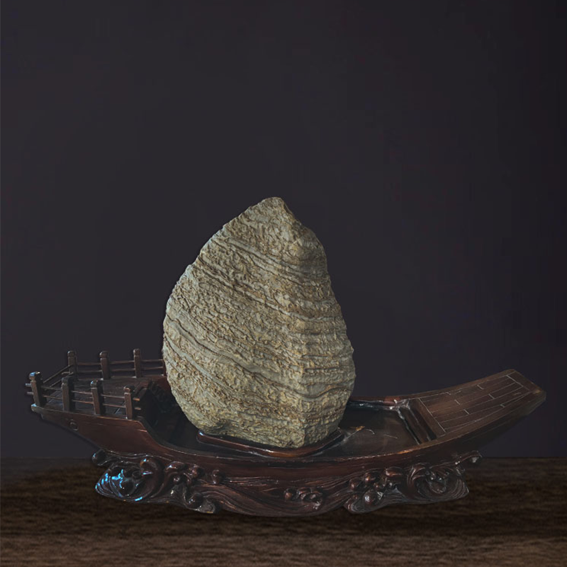 • 商品名称:【一帆风顺】来宾卷纹石配宝船形樟木座