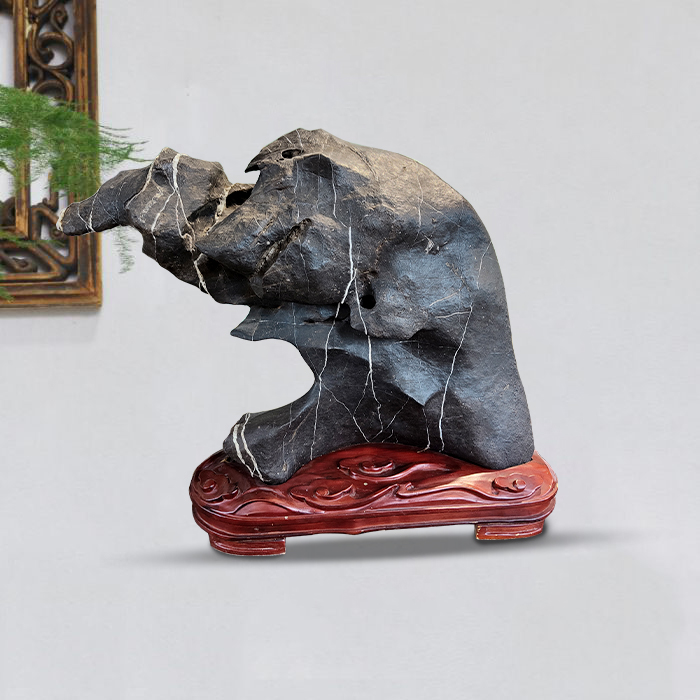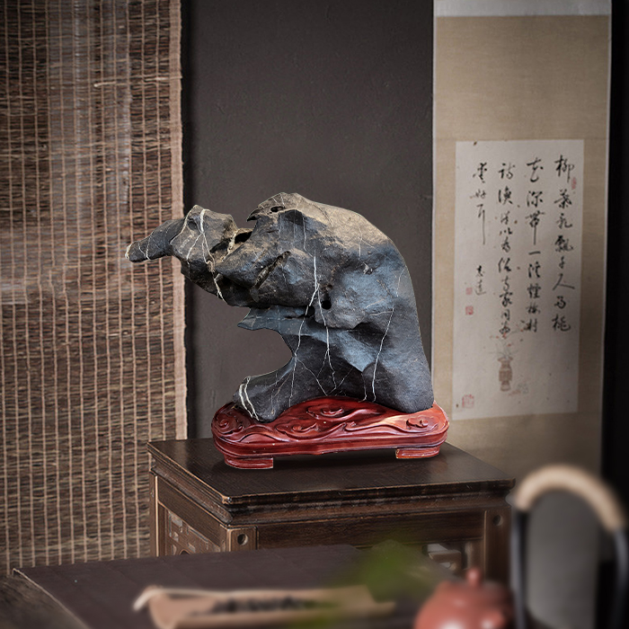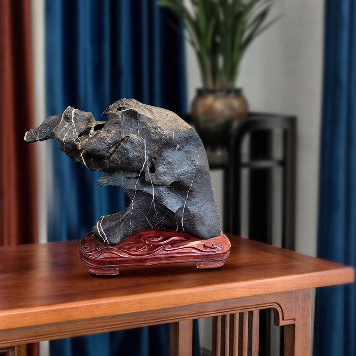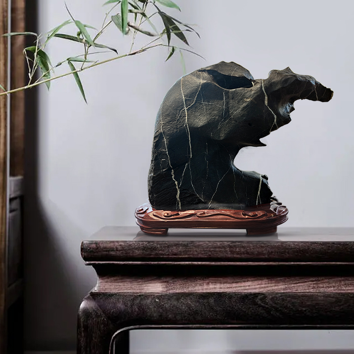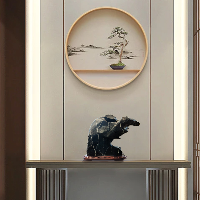 • 商品名称:【招财猪】奇石墨石配樟木实木底座摆件博古架案头摆件