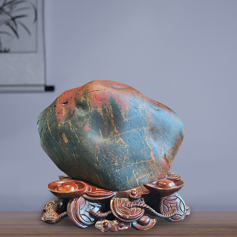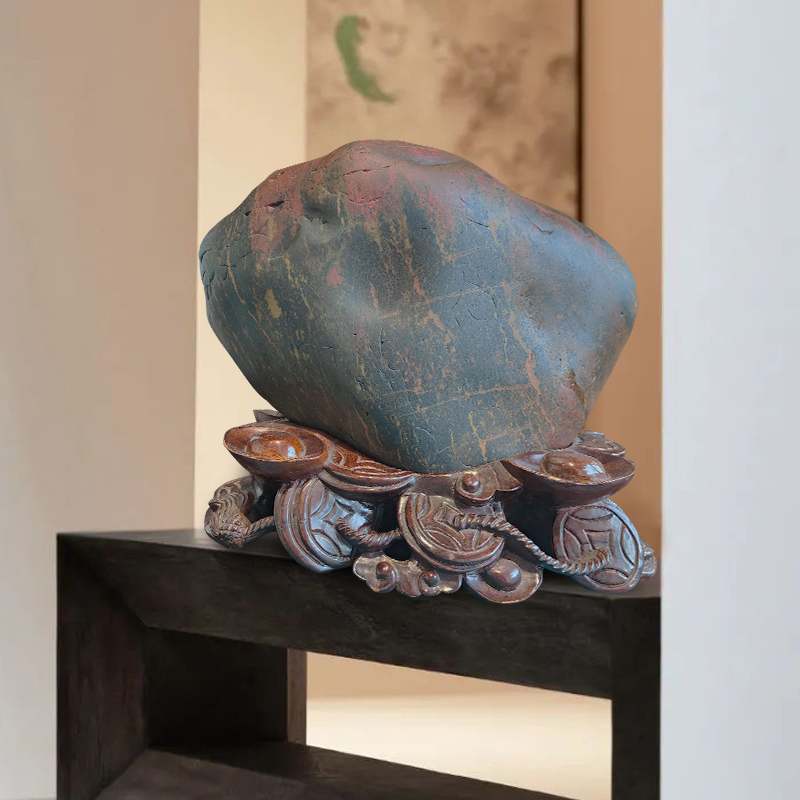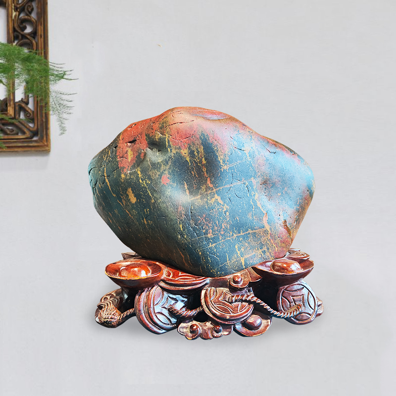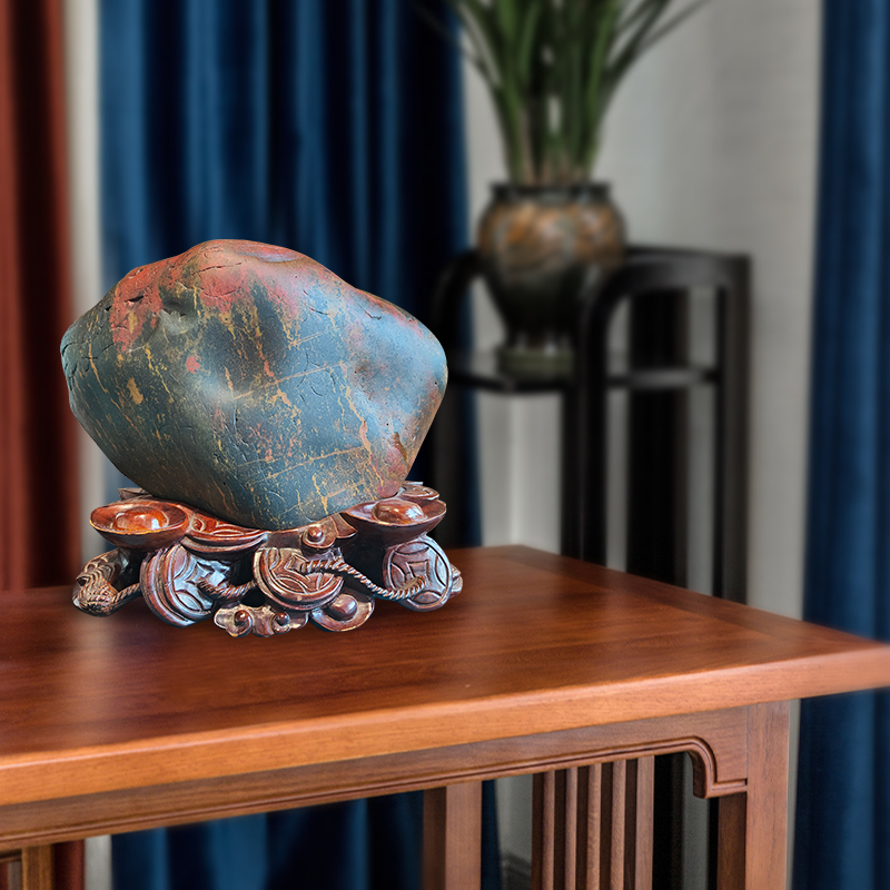 【三江红彩卵】配元宝聚宝盆樟木实木底座摆件博古架案头摆件
