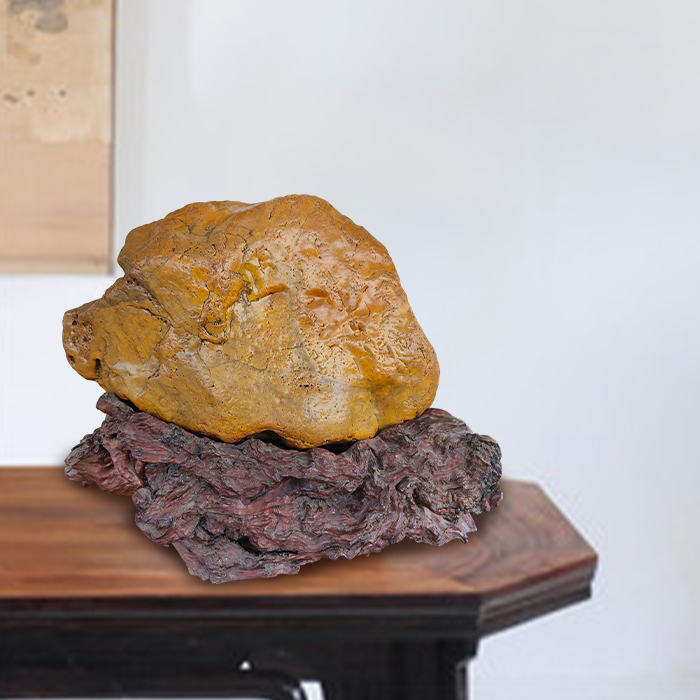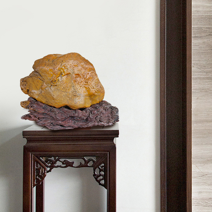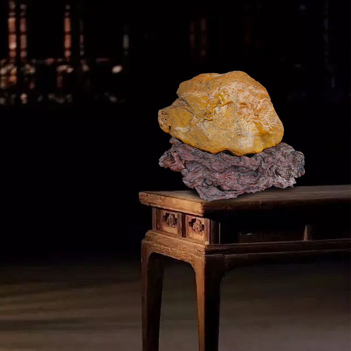 • 商品名称:【金猪纳福】黄蜡石配荔枝木底座古玩摆件
